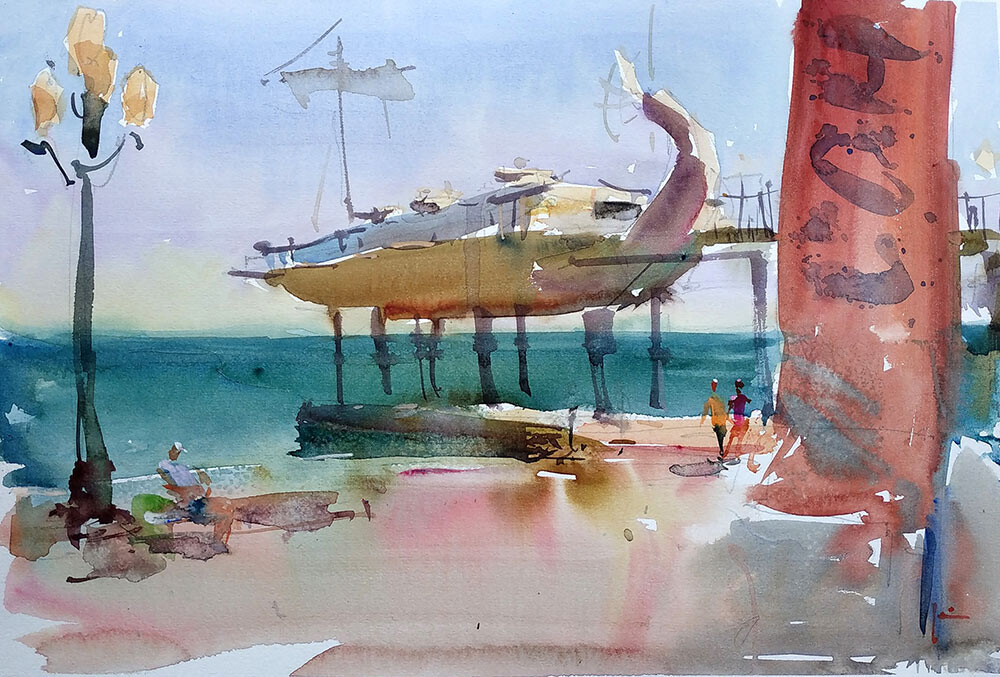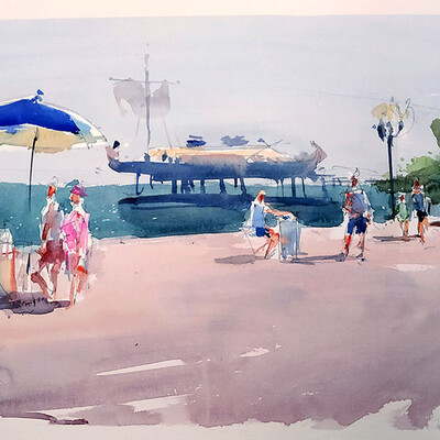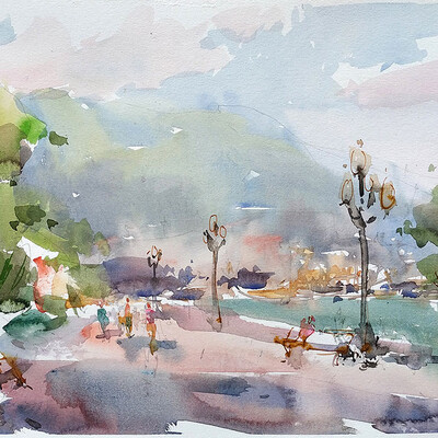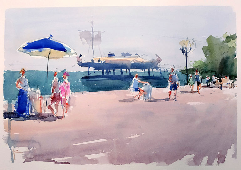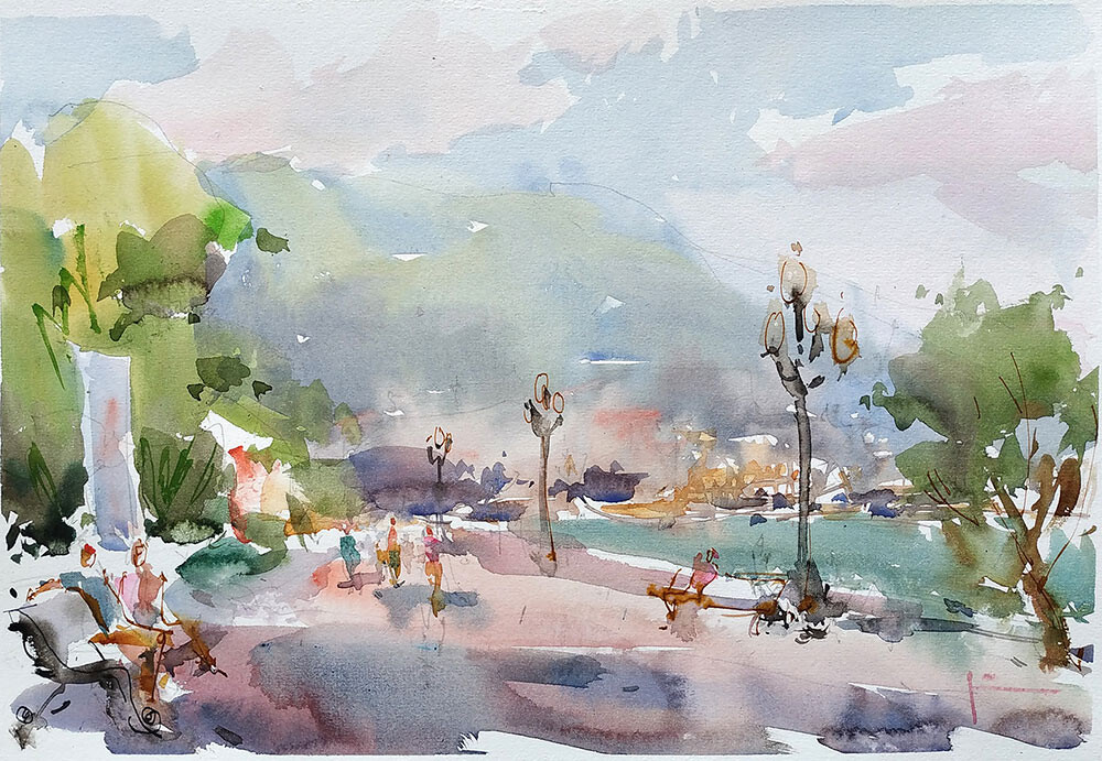 Мы будем писать три разных мотива набережной, освещенной солнцем. Будем писать свое отношение к этим пейзажам, ощущение. То есть не списывать буквально то, что видим, а трансформировать видимый сюжет, опираясь на свои эмоции на то, как бы мы хотели его увидеть и написать по-новому. Мы будем искать новое живописное решение, учитывая главные законы композиции, тепло-холодности и тона.